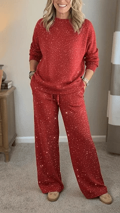 Veleaee 🎄 New Arrivals🔥 Cozy Travel Crew Neck Shiny Sweatshirt and Pant 2 Piece Sets